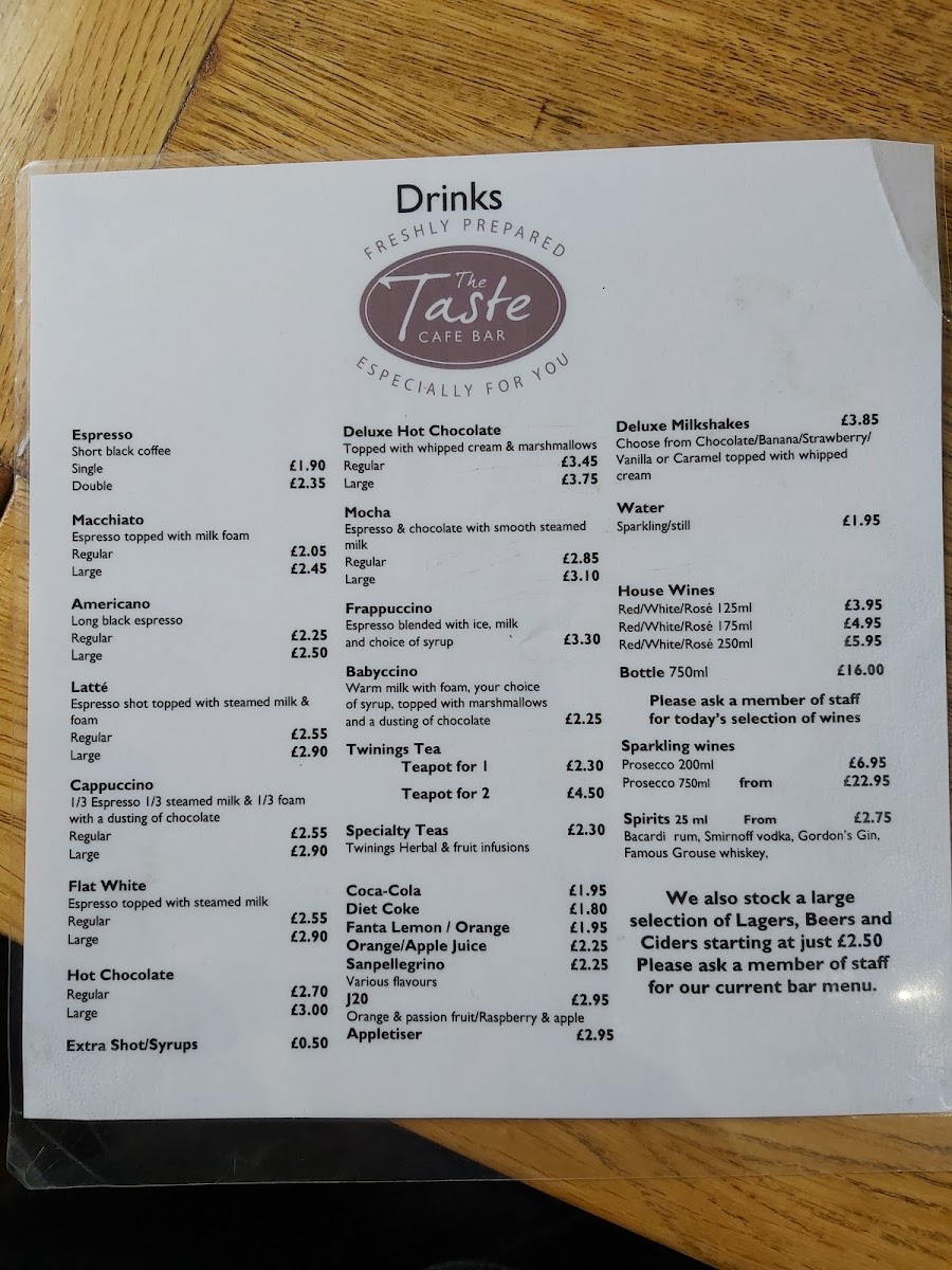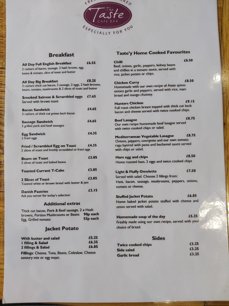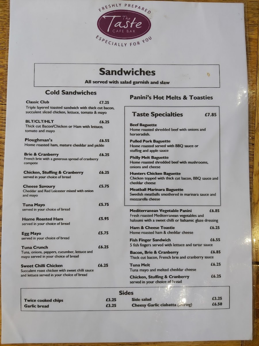 The menu at The Taste Cafe Bar offers a wide variety of delicious options perfect for any craving. For a light bite, the cold sandwiches include classics like Classic Club, BLT, Chicken, Stuffing & Cranberry, and the comforting Ploughman's. If you're in the mood for something rich and flavorful, the Brie & Cranberry sandwich is an excellent choice. To complement your sandwich, you can add a side such as the crispy Twice Cooked Chips, a refreshing Side Salad, or the indulgent Cheesy Garlic Ciabatta. For something a bit heartier, the Taste Specialties section boasts tempting options like the Beef Baguette, Pulled Pork Baguette, Philly Melt Baguette, Hunters Chicken Baguette, and Meatball Marinara Baguette. To finish off your meal, the drinks menu offers a range of coffee choices including Espresso, Macchiato, Americano, Latte, and Flat White.